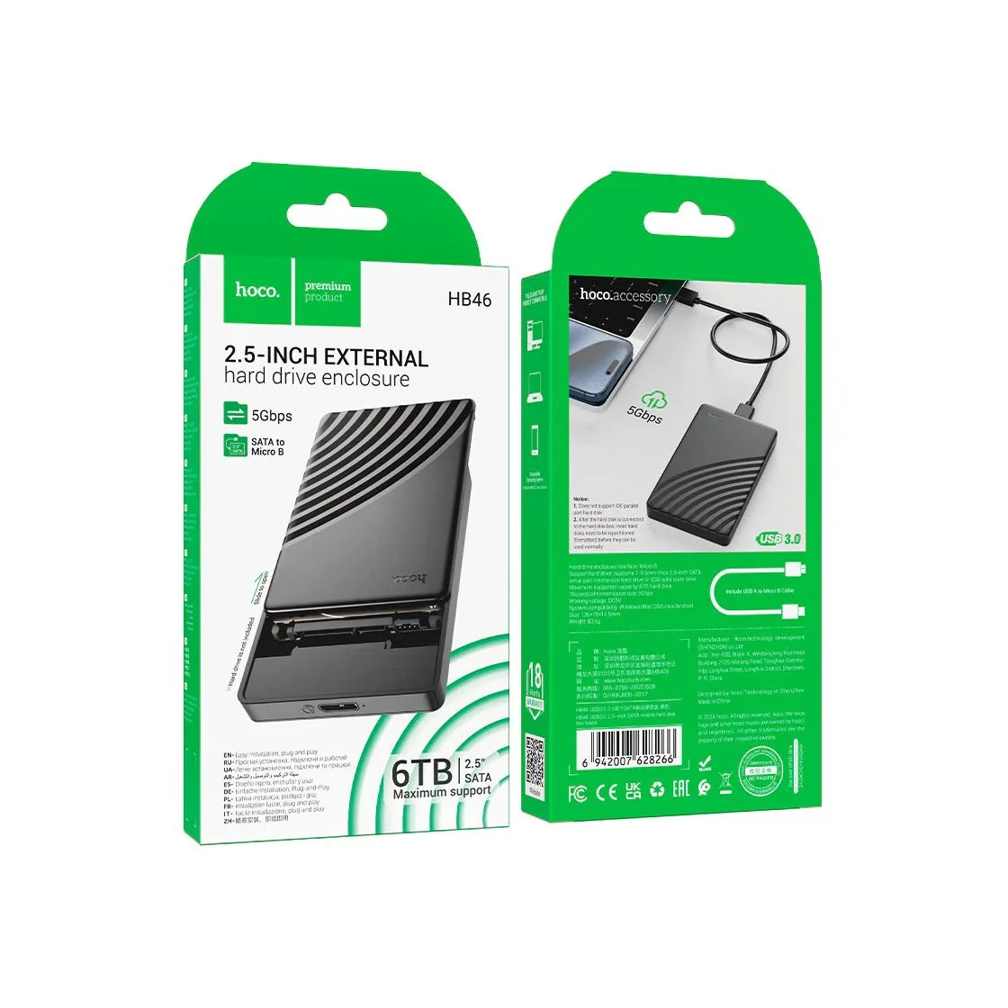 El Hoco HB46 cuenta con interfaz SATA + Micro-B USB 3.0, con una velocidad teórica de transferencia de hasta 5 Gbps, ideal para mover archivos grandes en segundos. Además, admite los protocolos UASP y TRIM, que mejoran la eficiencia del procesador, optimizan la lectura y escritura de datos y prolongan la vida útil del disco. Este cofre también incluye modo de suspensión inteligente, que reduce el desgaste del disco cuando no está en uso, minimizando el consumo energético y las pérdidas de rendimiento. Su estructura de ABS de alta resistencia brinda protección al disco duro contra golpes y sobrecalentamiento, manteniendo un funcionamiento estable. Compacto y ligero, el Hoco HB46 es el compañero perfecto para quienes necesitan movilidad, almacenamiento adicional o transferencia rápida de datos entre dispositivos.