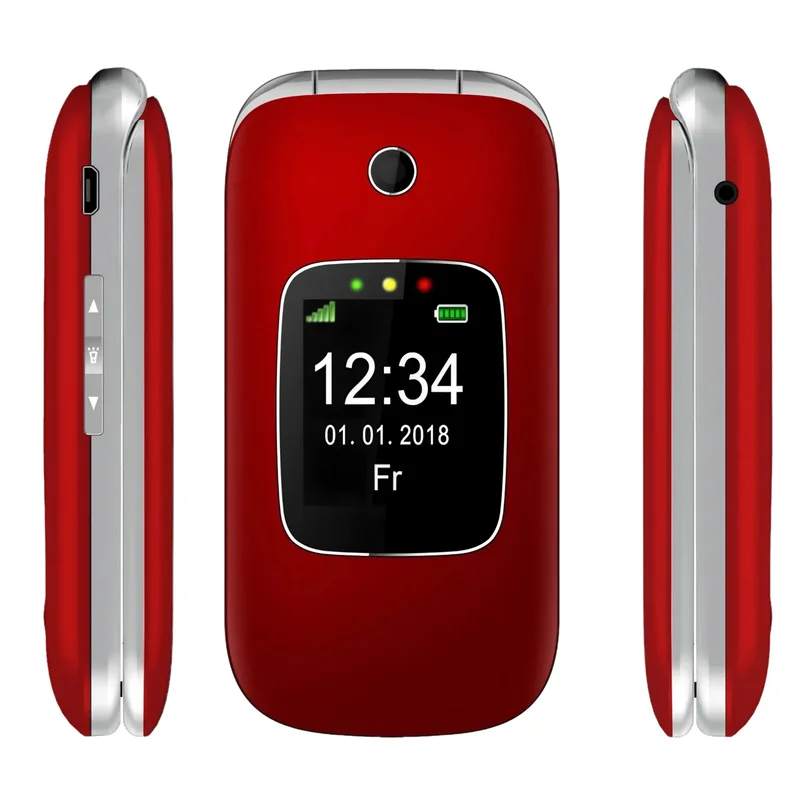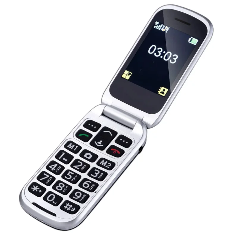 Este teléfono para adulto mayor integra una pantalla principal de 2,4” QVGA y una pantalla secundaria de 1,44”, que permiten visualizar la hora, llamadas y notificaciones sin necesidad de abrir el equipo. Su diseño compacto y ergonómico facilita la manipulación, mientras que su carcasa resistente y su altavoz de alta fidelidad aseguran una comunicación clara, incluso en entornos ruidosos.